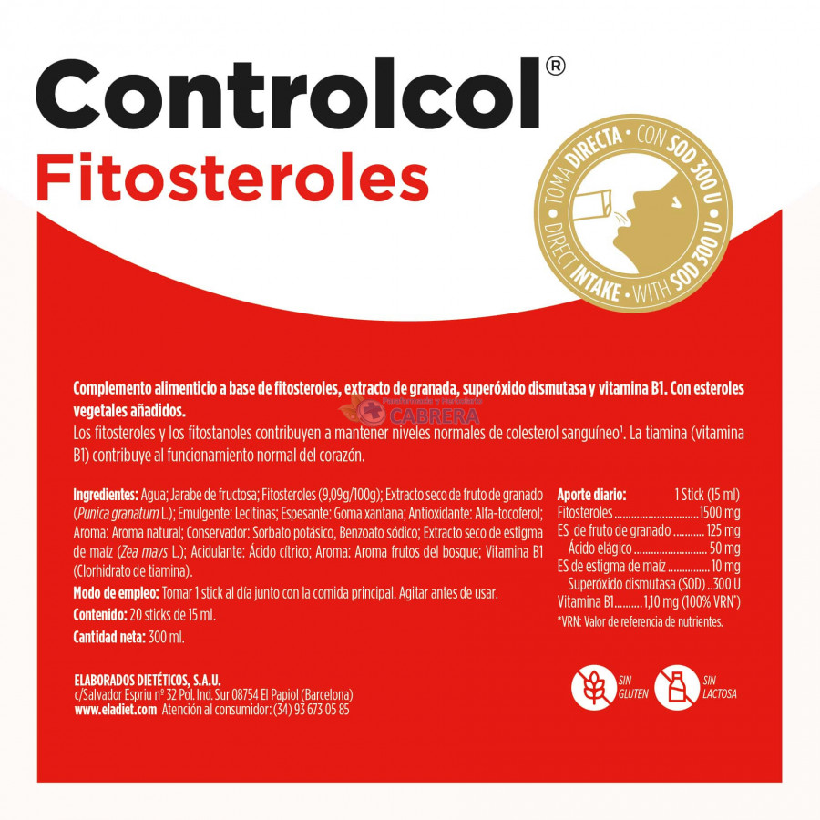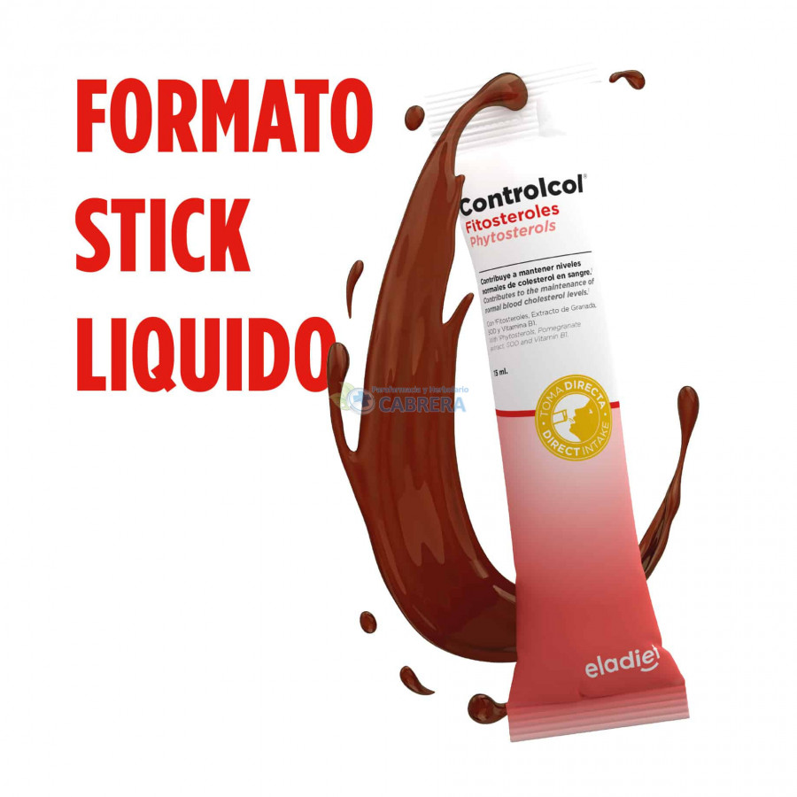 Por 1 stick: 1500 mg Fitosteroles vegetales, 125 mg Extracto seco de fruto de granado (Punica granatum L.) (50 mg Ácido elágico), 10 mg Extracto seco de estigma de maíz (Zea mays L.) (300 U Superóxido dismutasa), 1,1 mg Tiamina (Vitamina B1) (100% VRN*).