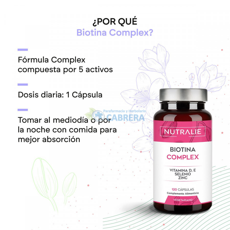 Biotin Complex de Nutralie contiene una dosis de biotina de 10.000 mcg, junto con zinc, selenio y vitaminas D y E. La biotina, el zinc y selenio contribuyen al mantenimiento del cabello en condiciones normales.